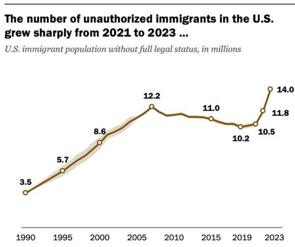 Graph: Please note the timing of the increase in immigrants into the US. It starts in 2020, the first year of the Covid-19 pandemic. The Global South was hit much harder in economic terms by the pandemic than was the North. Economic refugees from the pandemic fled north. The Biden administration responded by increasing deportations (graph above this one). From history, Mr. Biden’s vicious anti-immigrant rants of the 1980s and 1990s set the stage for Mr. Trump’s xenophobic appeals. Source: pewresearch.org.