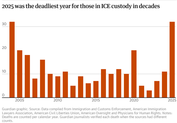 Chart: deaths of humans in ICE custody were the highest in 2025 that they have been in twenty years. This contrasts with Trump administration claims that ICE agents are in danger. No ICE agents have been killed by protestors or ICE targets since Mr. Trump restarted his deportation campaign. This suggests that being an ICE agent is in fact dangerous--- for the other 345,000,000 of us. Source: guardian.com.